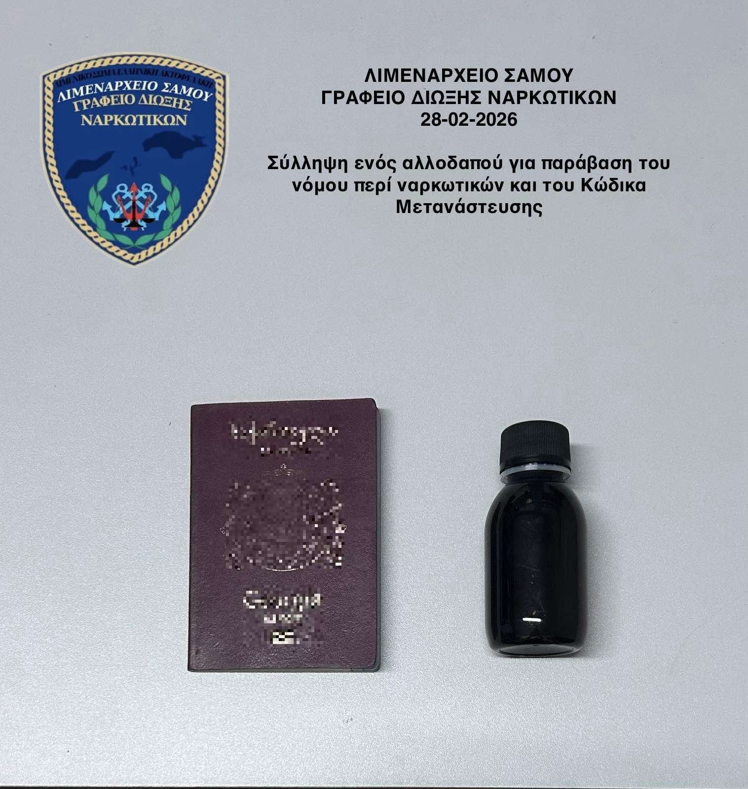 Τις πρώτες πρωινές ώρες χθες, συνελήφθη ένας 33χρονος αλλοδαπός (υπήκοος Γεωργίας) για παράβαση του άρθρου 20 του Ν. 4139/13 ¨περί εξαρτησιογόνων ουσιών¨ και του άρθρου 24 παρ. 6 του Ν. 5038/2023 ¨περί υποχρεώσεων ιδιωτών και υπαλλήλων στη διαδικασία χορήγησης και ανανέωσης άδειας διαμονής στην ελληνική επικράτεια¨, από στελέχη του γραφείου Δίωξης Ναρκωτικών της Λιμενικής Αρχής της Σάμου. Ειδικότερα, κατά την αποβίβασή του στο λιμάνι Μαλαγαρίου της Σάμου, από ένα επιβατηγό-οχηματαγωγό (Ε/Γ-Ο/Γ) πλοίο προερχόμενο από το λιμάνι του Πειραιά, εντοπίστηκε ο 33χρονος να κατέχει ένα πλαστικό φιαλίδιο που περιέχει ουσία (μεθαδόνη) σε υγρή μορφή χρώματος γαλάζιου μικτού βάρους σαράντα επτά γραμμαρίων και πέντε δεκάτων του γραμμαρίου (47,5 γραμ.), χωρίς σχετική ιατρική συνταγή. Επιπλέον σε σωματική έρευνα που του διενεργήθηκε βρέθηκε να κατέχει ένα διαβατήριο που ανήκει σε άλλο πρόσωπο. Από το Λιμεναρχείο Σάμου που διενεργεί την προανάκριση, κατασχέθηκε η ανωτέρω ναρκωτική ουσία.