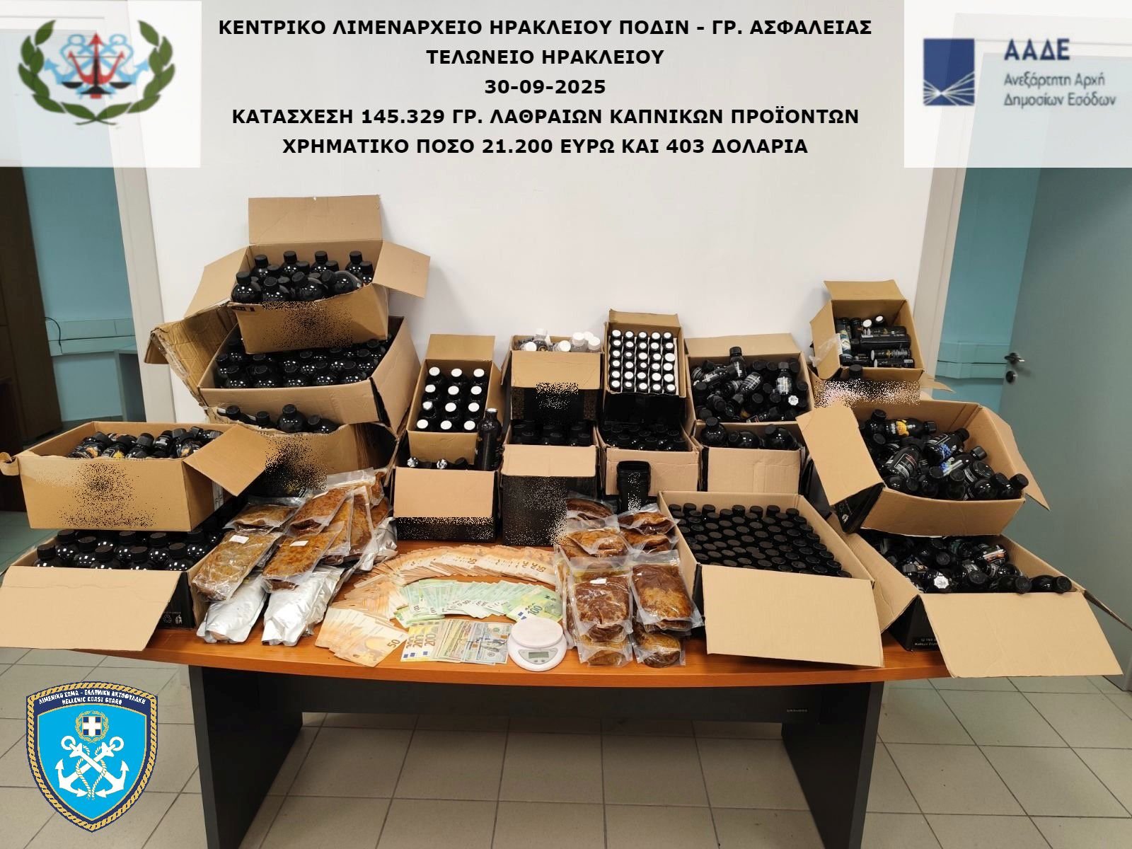 Από το Κεντρικό Λιμεναρχείο Ηρακλείου που διενεργεί την προανάκριση κατασχέθηκαν όλα τα ανωτέρω ανευρεθέντα. Τα καπνικά προϊόντα πρόκειται να παραδοθούν στο Τελωνείο Ηρακλείου με το συνολικό ύψος των διαφυγόντων φόρων και δασμών να ανέρχεται στο ποσό των τριάντα ενός χιλιάδων πεντακοσίων σαράντα δύο ευρώ και τριάντα λεπτών (31.542,30 €).