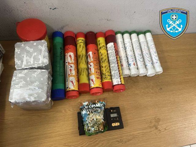 Ειδικότερα, στο πλαίσιο ελέγχων για την πρόληψη και καταστολή έκνομων ενεργειών, με τη συνδρομή του αστυνομικού σκύλου Λ.Σ. - ΕΛ.ΑΚΤ. ανίχνευσης ναρκωτικών ουσιών ¨ΚΕΛΥ¨, εντοπίστηκε ο 25χρονος, εντός επιβατηγού-οχηματαγωγού (Ε/Γ-Ο/Γ) πλοίου, να κατέχει στη χειραποσκευή του, μία πλαστική συσκευασία περιέχουσα φυτικά αποσπάσματα κάνναβης συνολικού μικτού βάρους έντεκα γραμμαρίων και ενός δεκάτου του γραμμαρίου (11,1 γρ), έξι ναυτικές ρουκέτες αλεξιπτώτου, πέντε καπνογόνα χειρός, δύο πυροτεχνήματα και ένα καπνογόνο ημέρας (βαρελάκι), τα οποία και κατασχέθηκαν.